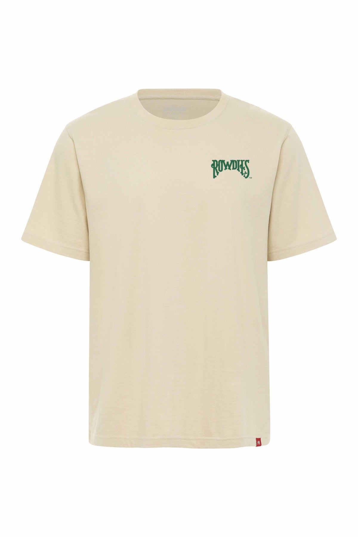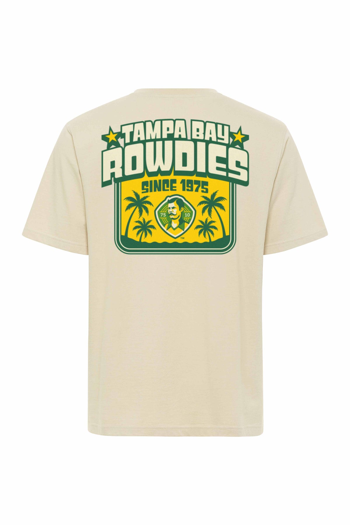 Tampa Bay Rowdies Tan tee featuring a "since 1975" crest with vibrant yellow and green palm trees on the back. Rowdies logo on the front in green.
