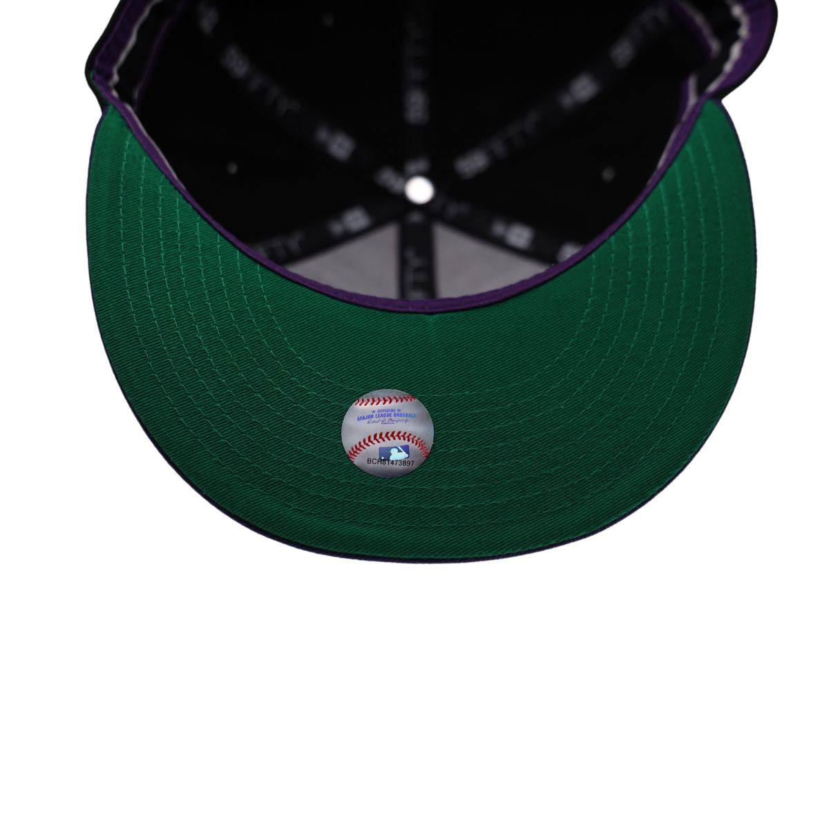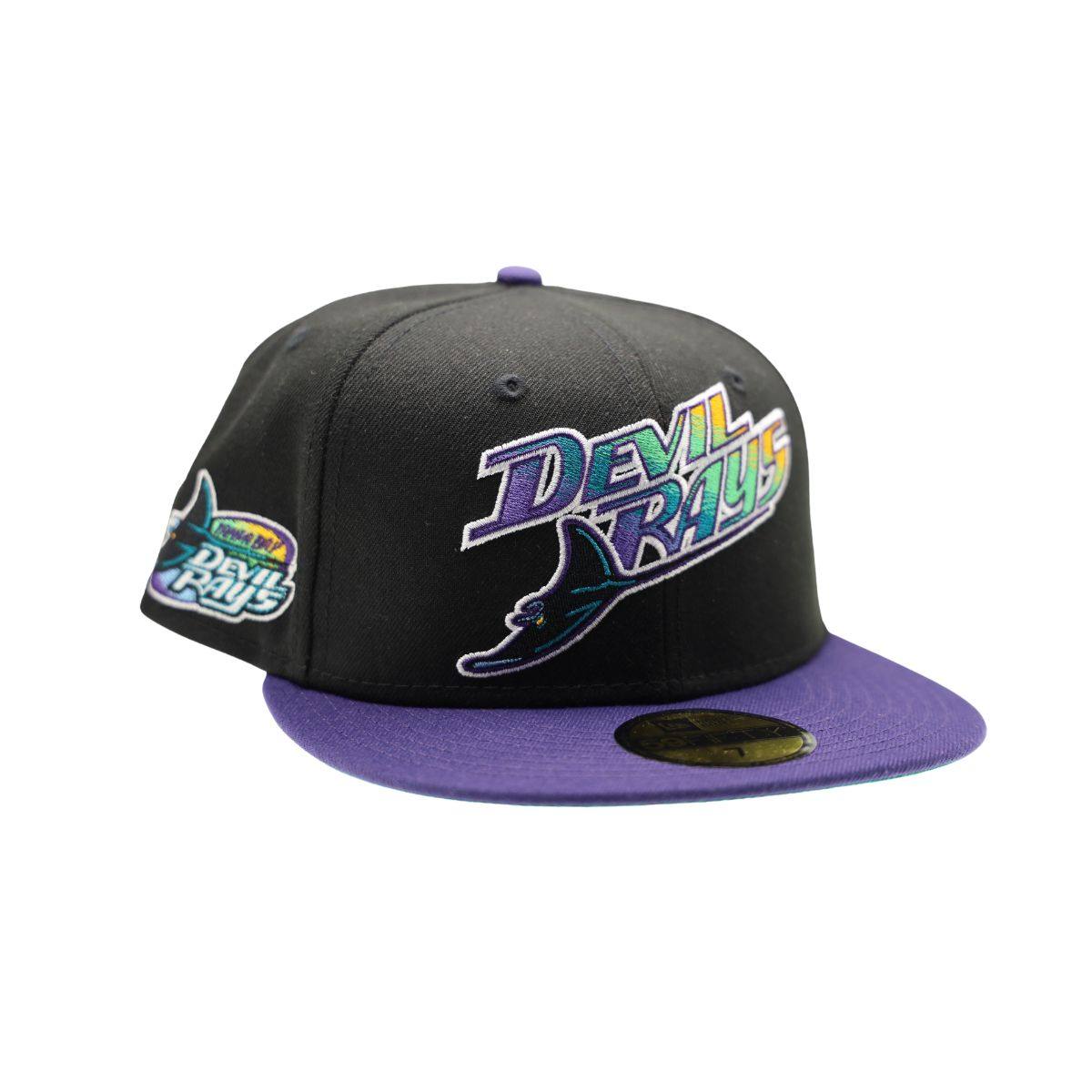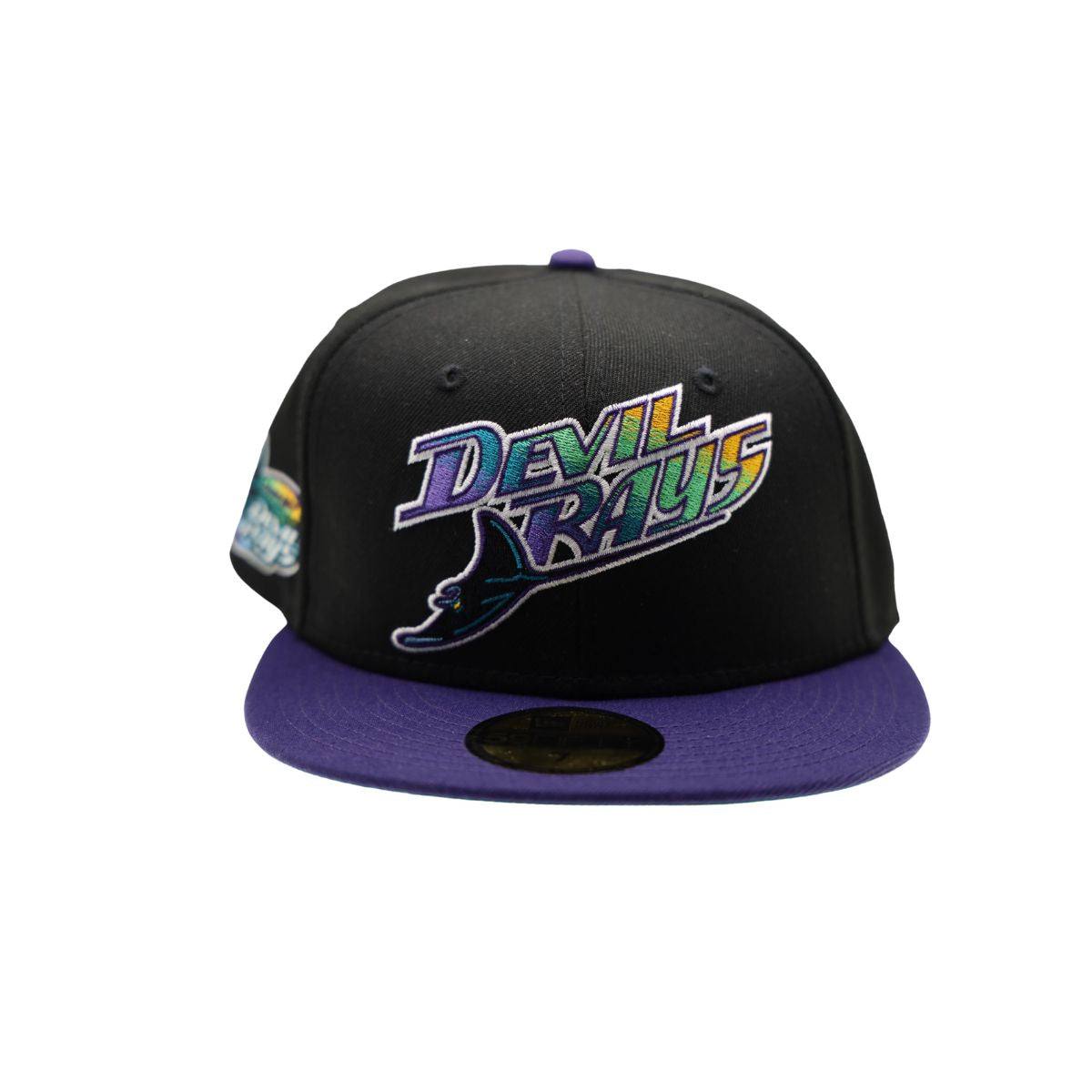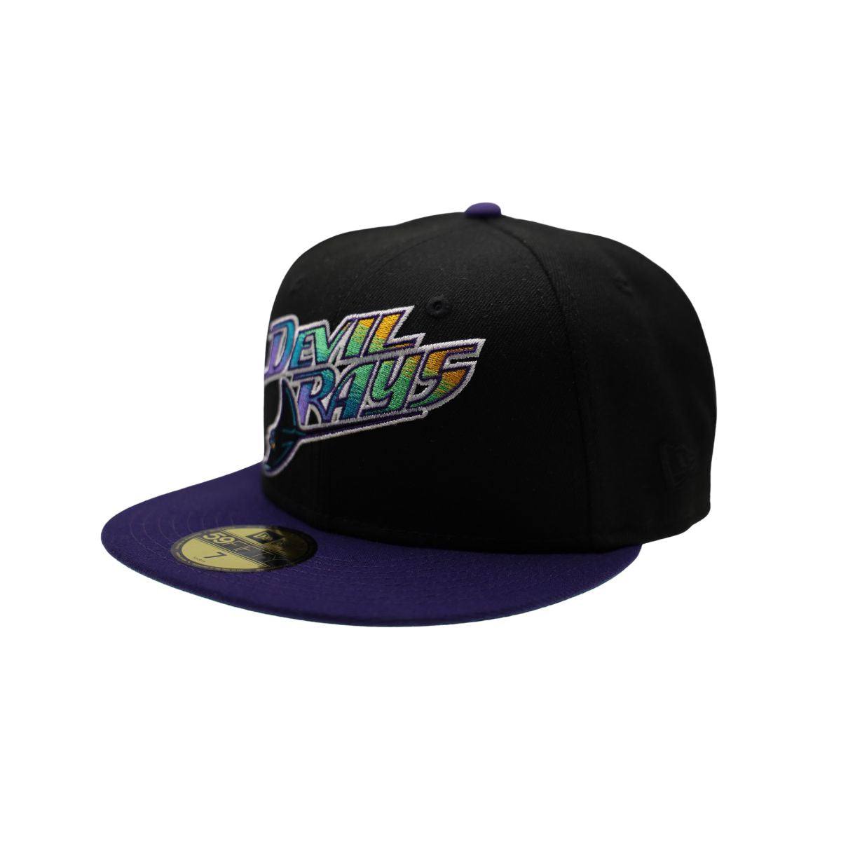 Throwback Devil Rays 59Fifty Hat from New Era featuring the retro Devil Rays Script Logo embroidered on the front panel, and the Tampa Bay Devil Rays Logo on side panel.  Black crown with purple bill and green under visor.