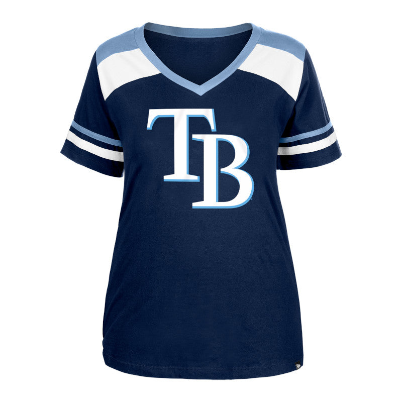 Rays Women's New Era TB Burst on Back V Neck T-Shirt Engineered for the discerning fan, this women's V-neck tee combines comfort with bold team spirit. The signature TB Burst graphic on the back delivers striking visual impact, while the tailored V-neck silhouette offers a flattering, contemporary fit. Crafted by New Era, a heritage brand synonymous with quality apparel, this shirt transitions seamlessly from casual wear to game day. Premium construction ensures durability through repeated wear and washing, making it a reliable staple for any Rays enthusiast's wardrobe.