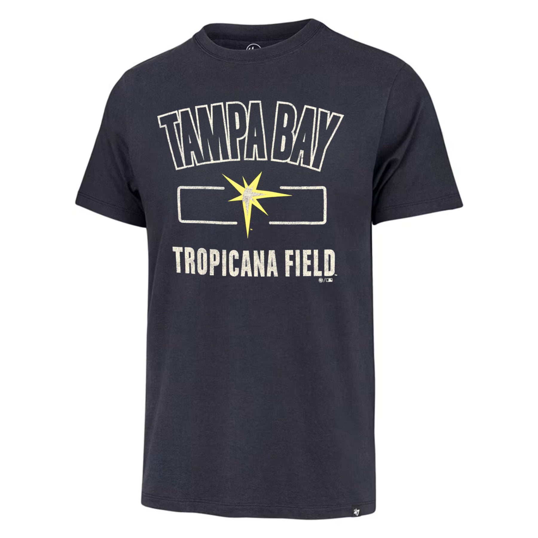 Rays Men's '47 Brand Navy Burst Tropicana Field Franklin Tee Show your Tampa Bay Rays pride in this classic '47 Brand tee. Featuring the iconic Burst Heater design on a navy backdrop, this short-sleeve shirt delivers timeless team spirit with everyday wearability. Made from 100% cotton with a tagless collar for all-day comfort, it's perfect for game days or casual outings. The screen-printed graphics stay vibrant wash after wash, while the quality construction ensures lasting durability. An officially licensed MLB essential for any Rays fan's collection.